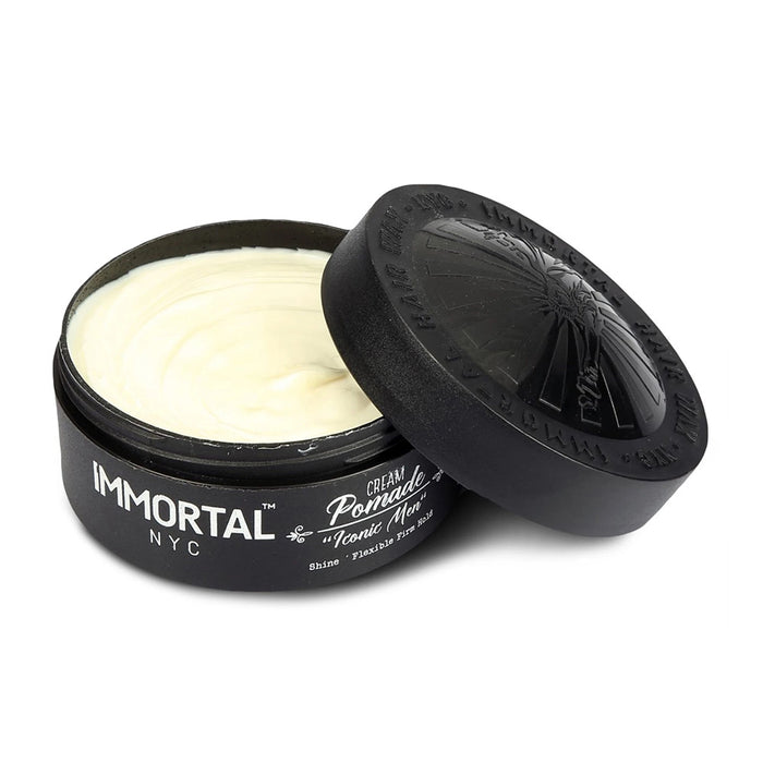 Immortal NYC - THE ICONIC MEN delivers unbelievable bulkiness and extraordinary texture with a gravity-defying formula. Emphasise your hair without any oily look, thanks to its CREAMY pomade structure. This formula has ingredients that help repel moisture so your hair style keeps looking great. Delivers a soothing and musky scent with a world famous perfume. Be anything but boring with Immortal NYC pomades, waxes, creams, colognes, and beard care products.