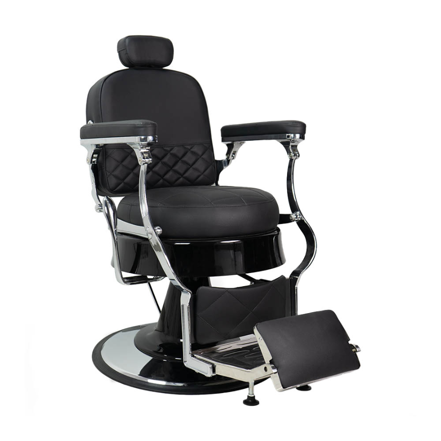 Introducing the deluxe black salon chair, a modern staple for any high-end salon or barbershop. This chair exudes luxury with its premium black quilted upholstery accented by a sleek diamond pattern that offers both comfort and style. It boasts a robust chrome-finished frame and a round heavy-duty base, ensuring stability and ease of use. The chair is fully equipped with padded armrests, an adjustable headrest, and a reclining back, perfect for a variety of beauty services.