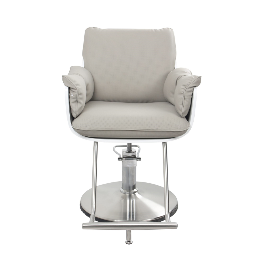 A chic salon chair with a plush, comfortable design, cushioned armrests, and a sleek circular chrome base featuring an integrated footrest and a hydraulic lift for height customization.