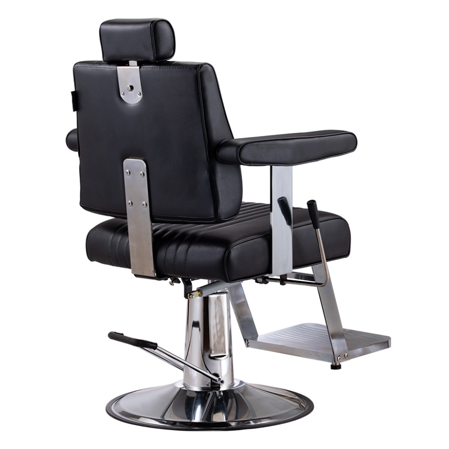 Introducing a sleek barber chair with an elegant design, featuring a streamlined seat with horizontal detailing, complemented by a lustrous metallic base.