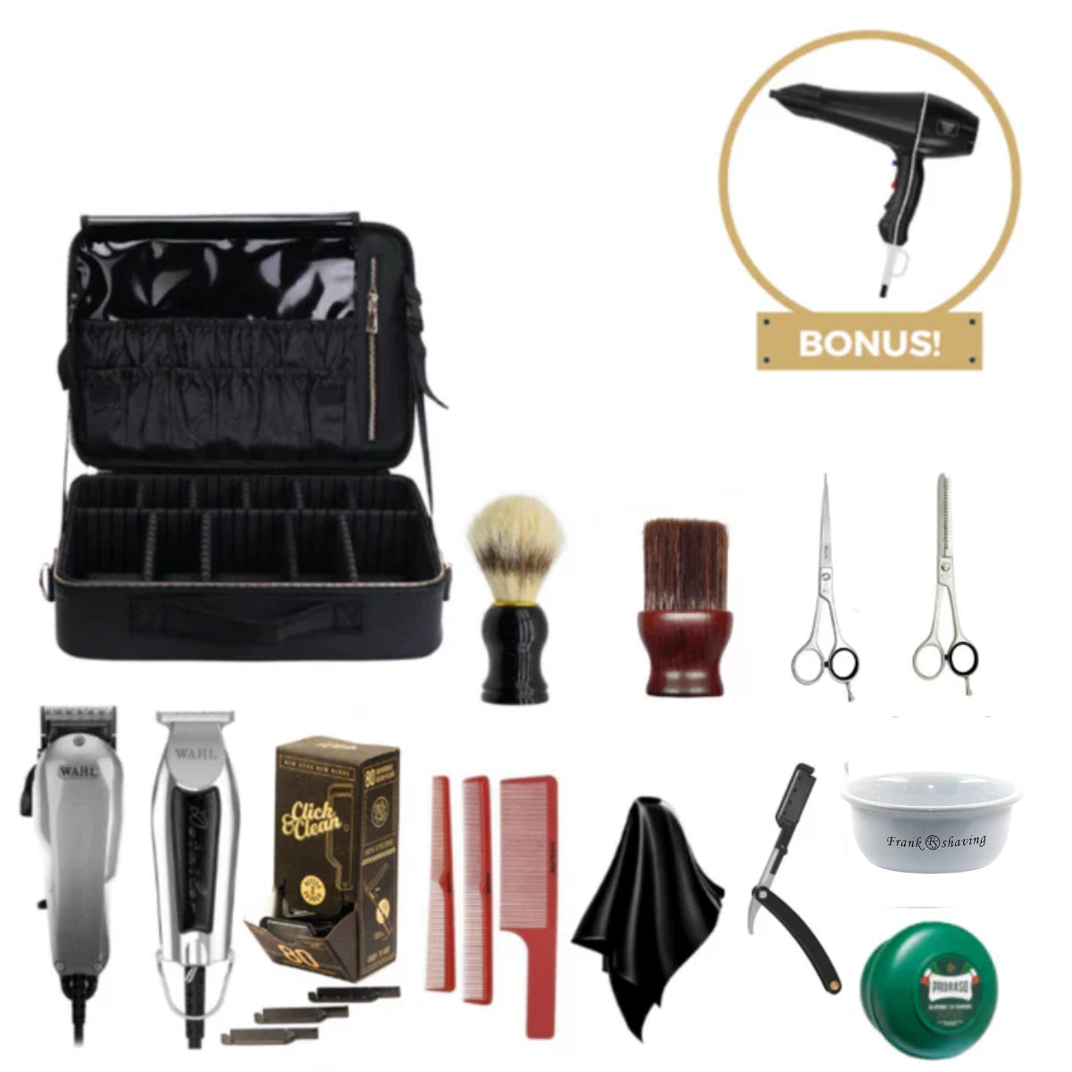 The complete BarberCo Professional Haircutting Kit. Includes the famous Wahl Burgundy Magic Clip and Wahl Beret Trimmer as well as our own BarberCo White Travel Tool Case you can configure to suit your style and a bonus 'Wahl Power Dry Black'.