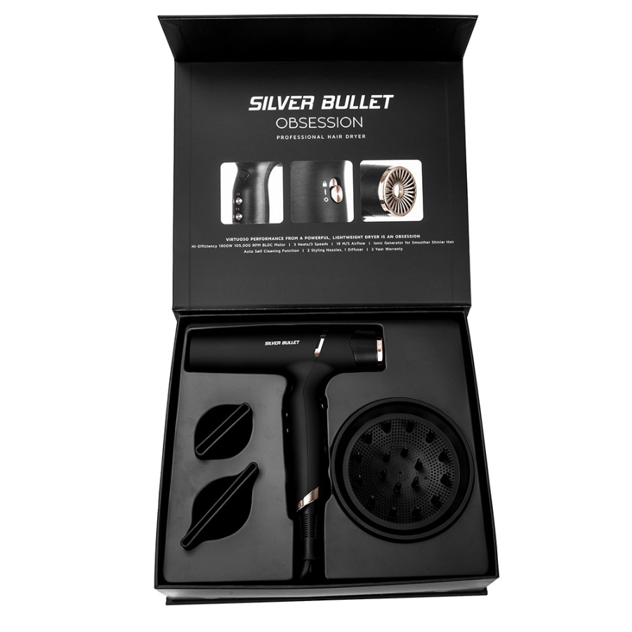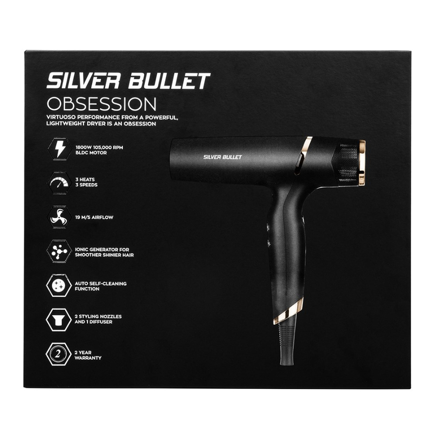 Look beyond traditional hair dryers. Silver Bullet Obsession Hair Dryer elevates blow-drying to the next level. Higher speed, lighter weight, digital technology, self-cleaning functionality and kinder to hair. Blow-drying is easier than ever before with a high efficiency 1800W 105,000 rpm motor, 19 m/s airflow and 3 heat/3 speed settings. Ionic generator for smoother, shinier results. Auto self-cleaning function for easy maintenance. Two styling nozzles and one diffuser. With sleek, futuristic design, Silver Bullet Obsession Hair Dryer sets itself apart as a new generation of hair dryer. Hotter. Faster. Better.