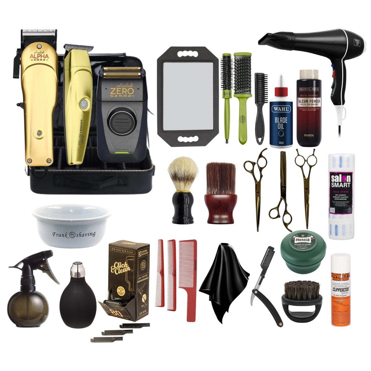 Ultimate Barber Case. Includes the Italian designed Gamma+ Clipper & Hitter Trimmer, Gamma+ Shaver, BarberCo White Travel Tool Case, plus a bonus Wahl Power Dry Black.